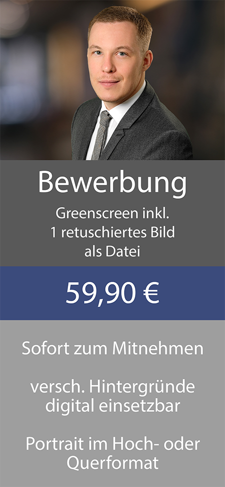 Wir fotografieren Dich bei deinem Bewerbungsshooting mit neuester Greenscreen-Technologie. Im Nachhinein kannst Du dich dann bequem für einen passenden Hintergrund entscheiden.